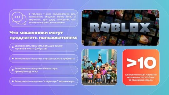 Прокуратурой Ростовской области реализуются мероприятия по правовому просвещению населения в целях противодействия преступлениям, совершаемым с использованием информационных технологий. За последнее время участились случаи мошенничества в отношении детей с использованием онлайн-игр (Роблокс, Страж королевства и других). Мошенники, используя виртуальные аккаунты, пишут детям сообщения с предложениями получить бесплатные бонусы или дополнительные ценные предметы на игровой платформе. Для реализации предложений просят несовершеннолетних направить фото банковских карт родителей, фото онлайн банка, прислать код из сообщения. Получая доступ к вышеуказанной информации, мошенники крадут денежные средства со счетов родителей, в ходе реализации преступного умысла угрожают несовершеннолетним обращением в правоохранительные органы, в случае информирования детьми родителей о произошедших фактах.